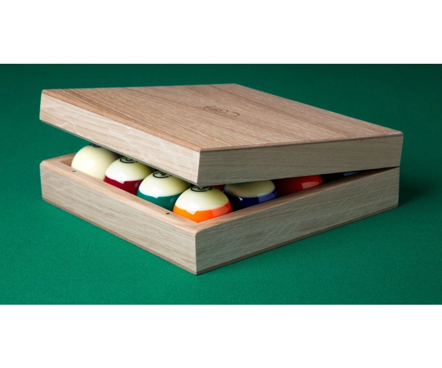 Each ball comes precision-engraved with the Aramith100 logo on it, all packaged in a box made of solid oak. The lid of the box has even been lined with Simonis 860 Yellow Green cloth.