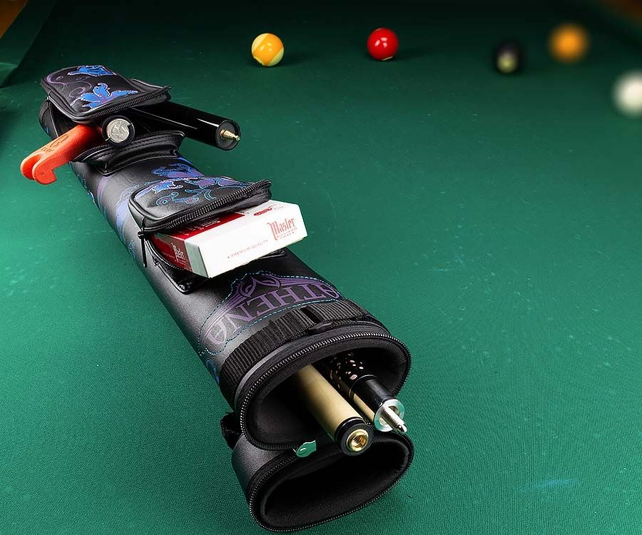 If butterflies are your favorite then you will love this 2 butt and 2 shaft hard case. This vinyl case is black with bright purple and blue butterflies featuring the new Athena owl logo. This case includes an upper handle and an adjustable shoulder strap.