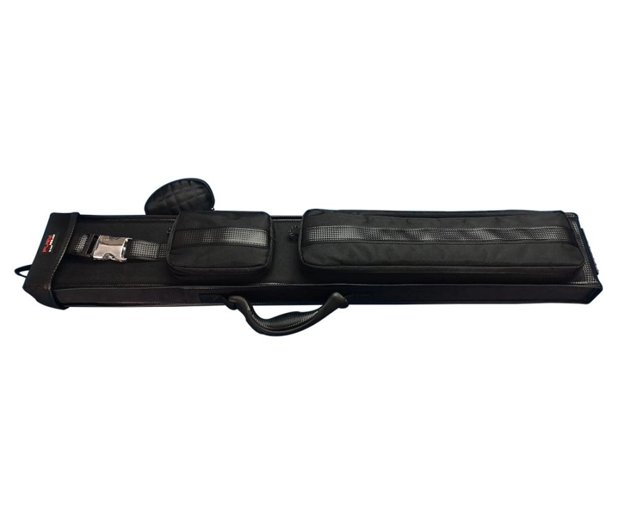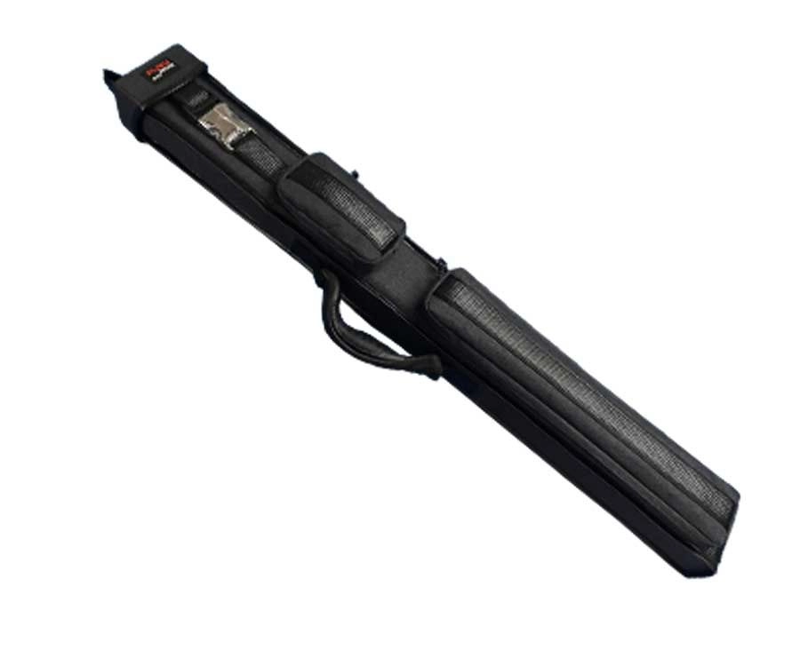 This case keeps it simple and is made of black vinyl and black trim. It safely packs 3 butts and 5 shafts. Fury could well be a trend setter with their design that opens at the top with a metal buckle. At a total length of 33″, tote around the case by it’s side carrying handle or shoulder strap! Consider storing the butt of your jump cue in the larger pocket that’s a length of 16″ and your tip tools in the smaller pocket above.